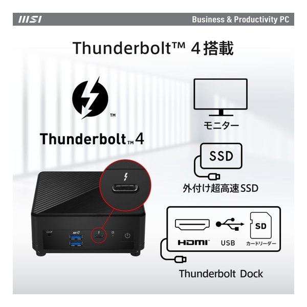 ビジネス用途に最適なWindows 11 Proをプリインストールし、拡張性に優れたThunderbolt4端子を備え、他の映像端子と併せて最大3画面出力に対応で、作業効率を大幅に向上することが可能です。