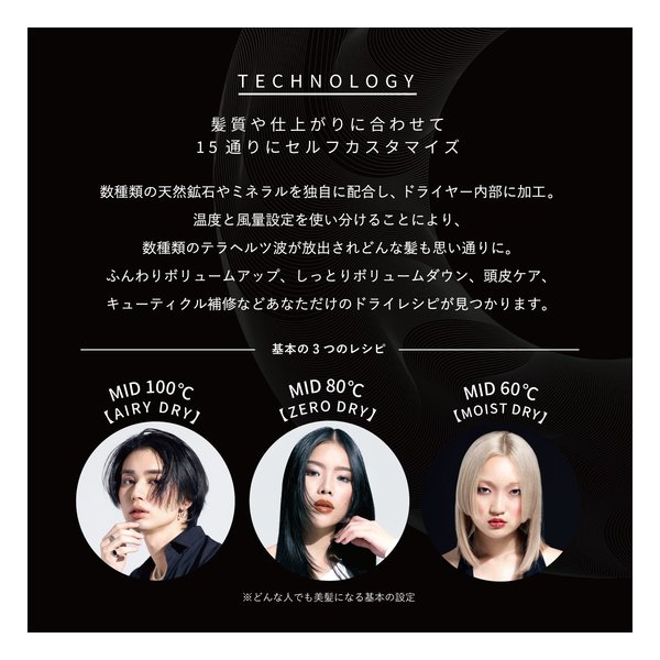 設定温度によって、速乾効果・保湿効果・キューティクル補修など、効果の異なるテラヘルツ波が発生し、目的に合わせて温度・風量を使い分けることでこれまでのドライヤーの機能を超えた髪質・ダメージケア、スタイルのベースづくりが可能に。
