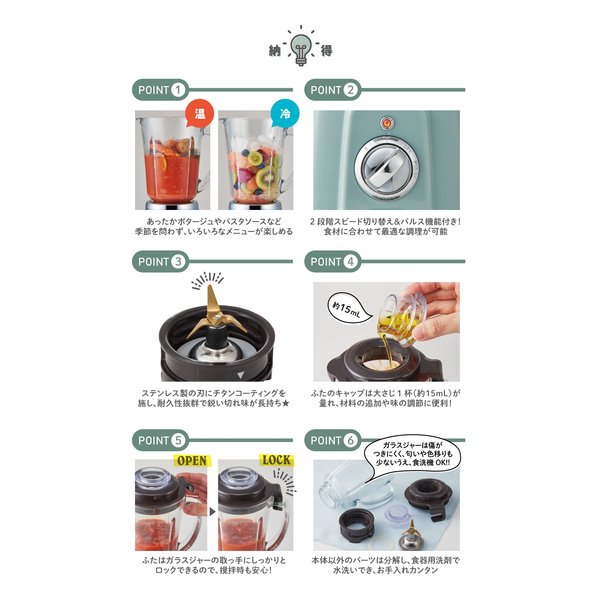 ●ふたはガラスジャーの取っ手にしっかりとロックできるので、撹拌時も安心!