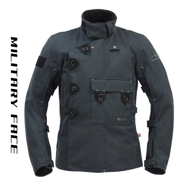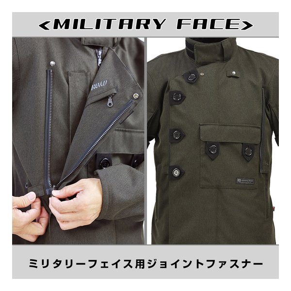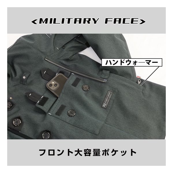 大容量のフロントポケットとダミーボタンがアクセントのミリタリーフェイスは、その大きくとられた前面生地が前立ての役割を果たし、防寒性能を高めると同時に、他にはない唯一無二のデザインを引き立てます。