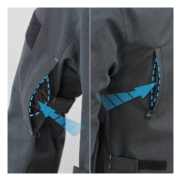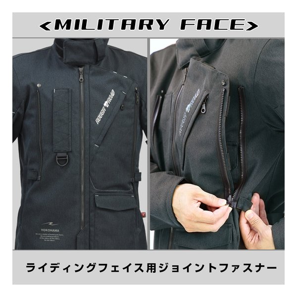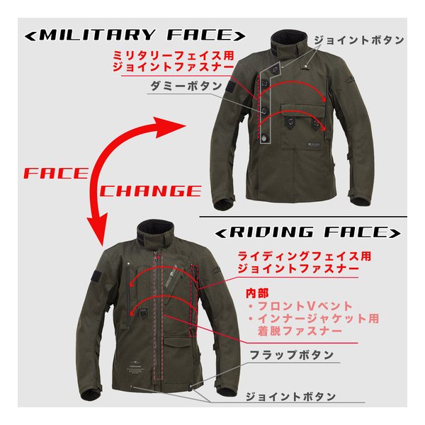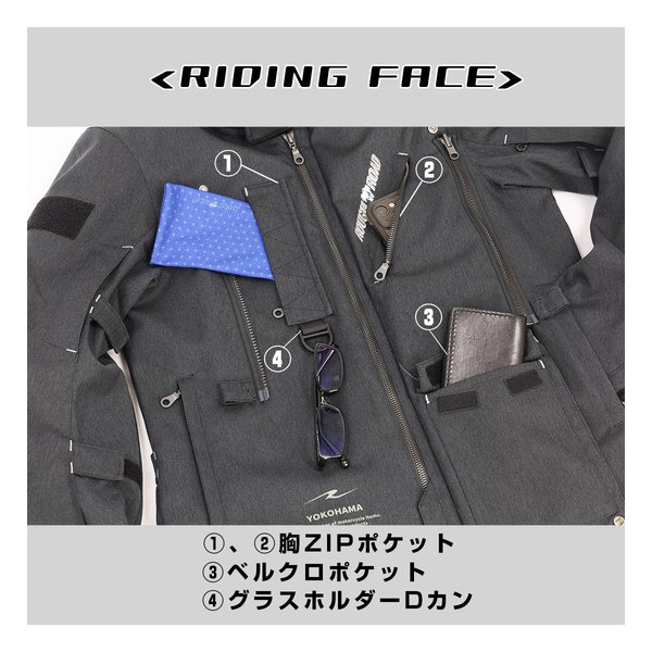 3種類のポケットが出現するライディングフェイスは、ミリタリーフェイスとは打って変わり実用性と通気性にシフトするラフアンドロードならではの機能を豊富に揃えました。