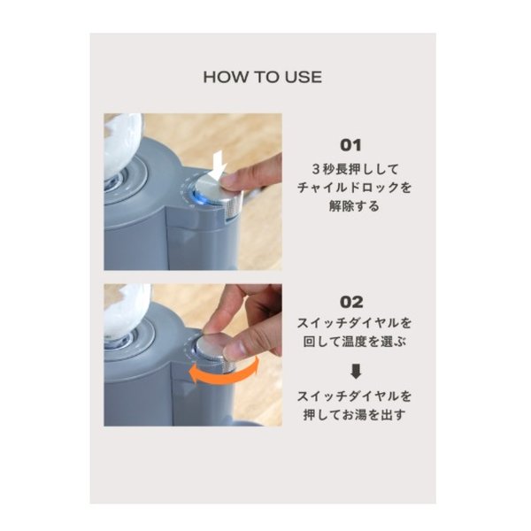 ●本体にペットボトルをセットし、お好みの温度を選んでダイヤルを押せば約2秒でお湯が出ます。