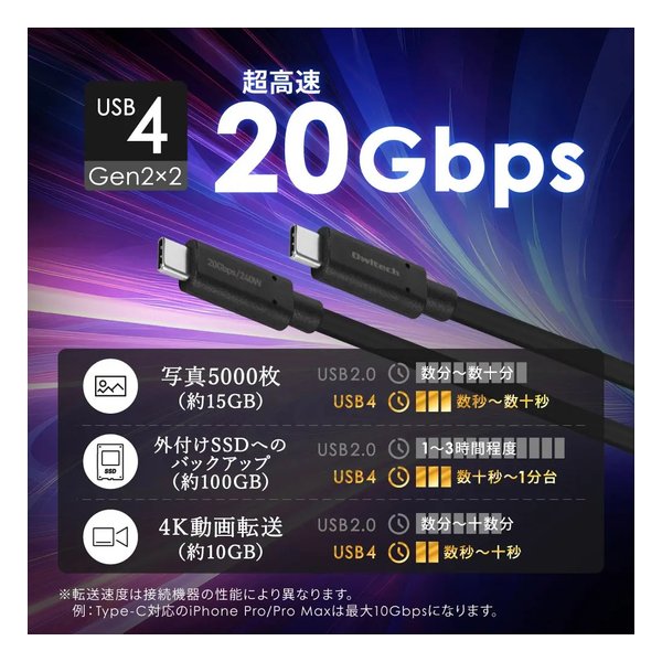 USB4 Gen2×2規格に準拠し、最大20Gbpsの超高速通信を実現しました。