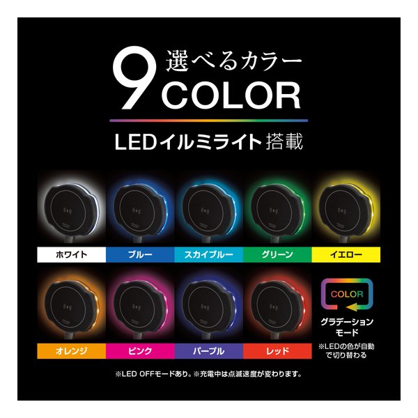 ●光の色を9色・グラデーションモード(色が順番に自動で切り替わる)から選択することができます。