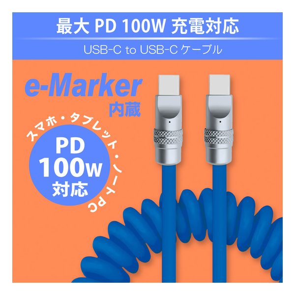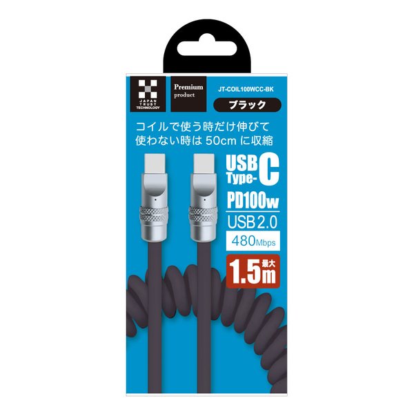 利用シーンに合わせてコイルが伸縮(2667204)PD100W シリコンコイルケーブル 1.5m ブラック