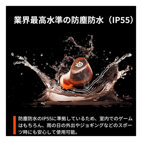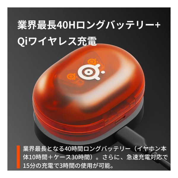 業界最長となる40時間ロングバッテリー(イヤホン本体10時間+ケース30時間)で、長時間のゲームプレイや音楽鑑賞に使用可能。急速充電にも対応しており、15分の充電で3時間の使用が可能です。またQi充電に対応したケースを採用しストレスフリーの充電を実現。